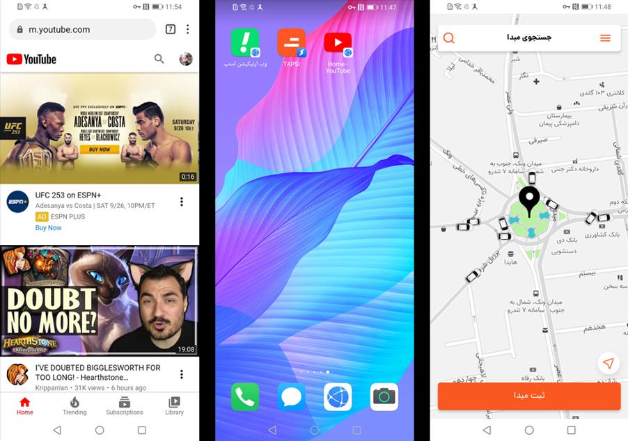 هواوی Y8p از جدیدترن رابط کاربری هواوی یعنی EMUI 10.1 استفاده میکند. در این رابطکاربری همه چیز در جای خود قرار دارد و با کمی تجربه و عادت به آن، تمام موارد به راحتی و سادگی در دسترس شما خواهد بود. این گوشی از سرویس موبایل هوآوی یا HMS استفاده میکند که به صورت اختصاصی توسط خود هواوی طراحی شده است. عملکرد این سیستم مورد بررسی قرار گرفت و تعدادی از اپلیکیشنهای محبوب کاربران مورد استفاده قرار گرفت که در مدت استفاده از گوشی (حدود یک هفته) امکان استفاده از همه آنها برای ما میسر بود. تعدادی از این اپلیکیشنهای بررسی شده شامل Youtube، اسنپ و تپسی است که عملکرد آنها در تصویر میبینید.