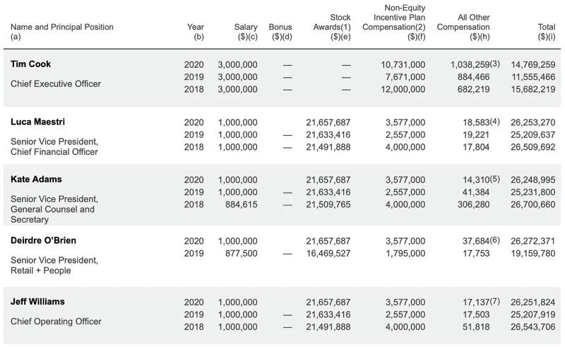 بر اساس جدیدترین نیابتنامهای که امروز از سوی اپل برای کمیسیون بورس و اوراق بهادار آمریکا فرستاده شد، مدیرعامل این شرکت، تیم کوک، در سال ۲۰۲۰ بیش از ۱۴ میلیون دلار حقوق گرفته است. البته دستمزد پایه او ۳ میلیون دلار بوده اما ۱۰٫۷۳۱٫۰۰۰ دلار دیگر را به صورت پاداش دریافت کرده است. عملکرد اپل در سال ۲۰۲۰ از نظر فروش خالص و درآمدهای اجرایی فراتر از اهداف این شرکت بود و باعث شد کوک و سایر مدیران بلندمرتبه شرکت پاداشهای زیادی بگیرند.