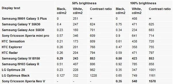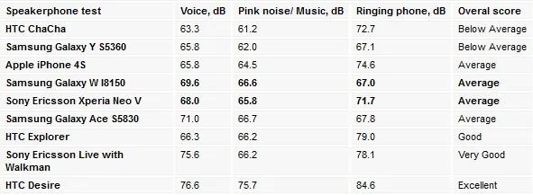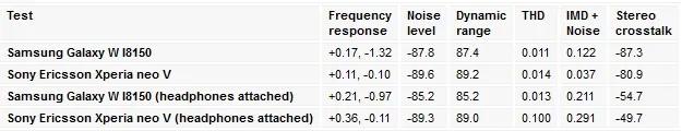 در هر حال هر 2 این گوشی ها یعنی سونی اریکسون Xperia Neo V و سامسونگ Galaxy W دارای کیفیت خروجی صدای تقریبا یکسان هستند و در این زمینه تفاوتی ندارند که کدام گوشی را انتخاب می کنید چرا که نتایج بدست آمده بسیار مشابه می باشند .در زیر می توانید جدول مقایسه ای را مشاهده نمایید :