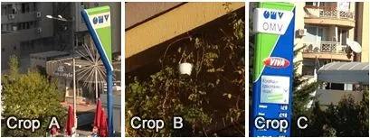 وضوح تصویر. برای ارزیابی وضوح تصویر، باید میزان جزئیات ثبت شده در تصویر نهایی را سنجید. در تصویر A به خطوطی که زاویه های مختلف دارند، در تصویر B به بافت دیوار، و در تصویر C به عدد های روی تابلوی قیمت پمپ بنزین توجه کنید.