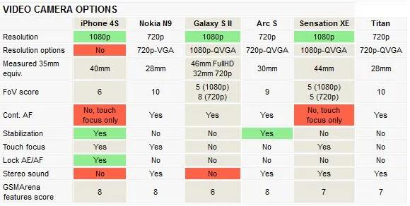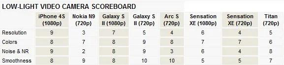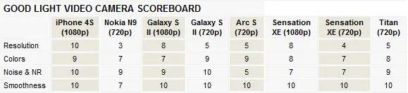 آیفون 4S به امتیاز کامل 10 خیلی نزدیک شد، و Galaxy S II با مقداری فاصله در مقام دوم قرار گرفت. نقطه ضعف S II در توازن رنگ ها بود، ولی در حالت p720 کیفیت بهتر شد، تا آنجا که ویدی p720 این گوشی در مقام اول قرار گرفت. در بین گوشی هایی که فقط ویدو های p720 ضبط میکنند، HTC Titan مقام اول را کسب میکند. N9از نظر روان بودن ویدو ضعیف عمل کرد، زیرا فریم ریت ویدئو های ضبط شده با آن از 24 فریم بر ثانیه فرا تر نرفت (در حالت فیلم برداری در تاریکی این عدد بیشتر بود، در قسمت بعد توضیح بیشتری میدهیم).