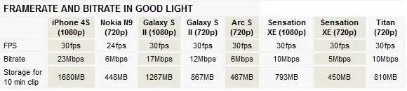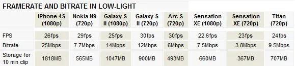 فریمریت و بیتریت. برای بیشتر گوشی ها، با کمتر شدن نور محیط فریمریت نیز کاهش پیدا کرد. در این زمینه بیشترین افت فریمریت مربوط به Sensation XE بود که فریمریت آن تا پایین تر از 24 فریم بر ثانیه کاهش یافت. دیدن این که فریمریت نوکیا N9 در این حالت به 29 فریم بر ثانیه افزایش پیدا کرد، ما را شوکه کرد. ما فیلم برداری با این گوشی در شرایط نوری دیگر را نیز امتحان کردیم و باز هم دیدیم که هر چه محیط تاریک تر باشد، فریم ریت به 30 فریم بر ثانیه نزدیک تر است. به عقیده ما، این رفتار باید با میزان جزئیاتی که مورد پردازش هرر میگیرند در ارتباط است.