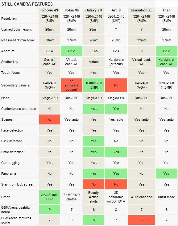 همه موارد در این جدول وجود دارند. از جمله وضوح تصویر، محدوده تصویر(scenes)، تنظیمات ( ISO، sharpness، و غیره) و مواردی مثل قابلیت اجرای دوربین در حالت قفل شده گوشی. اهمیت این موارد، برای همه کاربر ها یکسان نیست. میتوان افکت ها را در هنگام گرفتن عکس و یا پس از آن و توسط یک برنامه دیگر اعمال کرد. ما افکت ها را هم بررسی کرده ایم، ولی آنها در رتبه بندی نقش مهمی ندارند. درجدول، این موارد با جواب بله یا خیر مشخص شده اند، ولی در باره جزئیات آنها توضیحی داده نشده است. هر یک از این گوشی ها، ویژگی های برجسته خودش را دارد، برای همین در مرحله اول سریعا هر یک از آنها را مورد بررسی قرار میدهیم.آیفون 4S کمترین تنظیمات قابل تغییر را در میان شش گوشی دارد. شما فقط میتوانید تگ جغرافیایی، خط کشی منظره یاب و فکوس لمسی را فعال کنید. ولی حالت HDR و قفل AE/AF در این گوشی در بین همه اسمارت فون ها، بهترین هستند. بنابراین، بر خلاف آنچه محیط ساده برنامه دوربین 4S نشان میدهد، گرفتن عکس با این دوربین میتواند با تنظیمات متنوعی انجام شود.