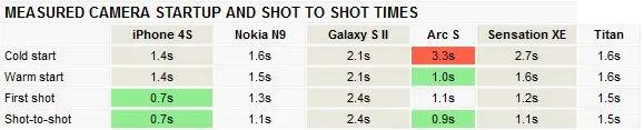 آیفون 4S سریع ترین دوربین را داشت و وقفه 7/0 ثانیه ای بین عکس های متولی آن واقعا تأثیر گذار بود. Xperia arc S سونی اریکسون با وقفه 9/0 ثانیه ای بین گرفتن عکس های متولی توانست به آیفون نزدیک شود و با داشتن warm start 1/1 ثانیه، توانست از آیفون با 1/4 ثانیه جلو بیفتد. با این حال، arc S هنگام وارد شدن به برنامه دوربین زمان زیادی میگیرد، و از این لحاظ جایگاه آخر را به دست می آورد.