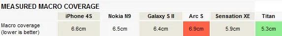 Galaxy S II با وجود قوی تر بودن در نزدیک شدن به سوژه، نتوانست بیشترین بزرگنمایی را ارائه دهد و این مقام به HTC Titan رسید. در این قسمت بد ترین عملکرد مربوط به Xperia arc S سونی اریکسون بود، ولی اختلاف خیلی زیاد نبود، و در حدود 30% میشد.البته در مورد همه دوربین ها، گاهی با وجود اعلام شدن فکوس، فکوس انجام نشده بود و بنابراین ممکن است تعدادی از عکس ها خراب شوند. این مشکل معمولا هنگام استفاده از فکوس خودکار پیوسته اتفاق میافتد.