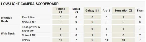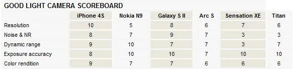 توانایی دوربین گوشی های مختلف، با هم متفاوت است. بنابراین برابر بودن امتیاز دو گوشی در یک زمینه خاص لزوما به معنی مشابه بودن نتیجه نیست. در HTC Titan کلید شاتر واقعا راحت طراحی شده که این به بالا رفتن امتیازش کمک کرد. لرزش گیر ویدئوی آیفون 4S به خوبی عمل میکند ( ولی دکمه کنترل حجم صدا، برای استفاده به عنوان دکمه شاتر گزینه مناسبی نیست). arc S با گرفتن امتیاز خوب در زمینه های مختلف، و استفاده از کلید سخت افزاری برای شاتر (که میتوانست خیلی راحت تر باشد)، مجموعا قوی ارزیابی شد.