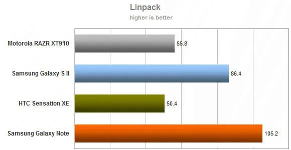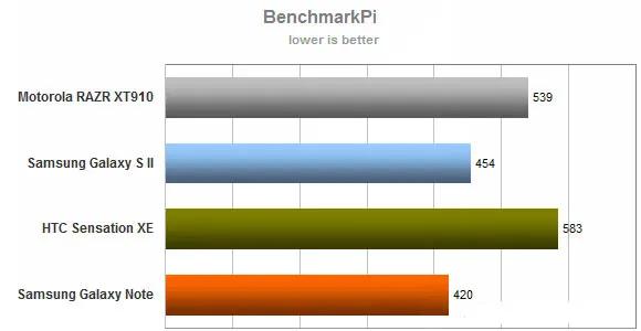 مقایسه ترکیبی موتورولا RAZR به چیپست OMAP 4430 Texas Instruments مجهز است. درون آن، دو هسته Cortex-A9 با سرعت پردازش 2/1 گیگا هرتز، یک رم 1 گیگا بایتی، و یک GPU PowerVR SGX540 جای گرفتهاند. این ترکیب نسبتا قدرتمند به نظر میرسد، بیایید ببینیم جدول مقایسه ما چه میگوید.ما تست های single-threaded BenchmarkPi و muti-threaded Linpack benchmark را اجرا کردیم و موتورولا RAZR موفق شد بر HTC Sensation XE (با دو هسته پردازنده 5/1 گیگاهرتزی) غلبه کند ولی در مقابل چیپست Exynos سامسونگ ش کست خورد.
