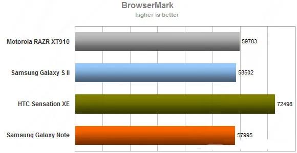 موتور جاوا اسکریپت در مرورگر RAZR نسبتا خوب عمل کرد و در سطح Galaxy S II بود (با وجود پایینتر بودن CPU ). موتورولا RAZR در این قسمت بهتر از Sensation XE عمل کرد، ولی در تست ترکیبی HTML5 مرورگر HTC موفق تر بود.