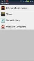 بر روی گوشی، یک برنامه مدیریت فایل نیز نصب شده که با آن میتوان به فایل های روی حافظه 16 گیگا بایتی و نیز کارت حافظه microSD دسترسی پیدا کرد. همچنین، با استفاده از MotoCast امکان به اشتراک گذاری فایل ها و استفاده از فایل های کامپیوتر های دیگر از طریق شبکه Wi-Fi وجود دارد.