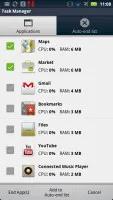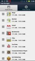 همانطور که گفتیم، گروه recent وظیفه task switcher را انجام میدهد. این خوب است، زیرا از یک جدول 4 در 5 از آیکن ها استفاده میکند که در مقایسه با چیدمان 2 در 3 task switcher اندروید بهتر در صفحه فیت می شود. یک Task Manager نیز در این گوشی وجود دارد که داری دو سربرگ Applications و Auto-end list است. میتوانید چندین برنامه را انتخاب کنید و با هم ببندید و یا آنها را به auto-end list اضافه کنید. برنامههایی که وارد این لیست شوند، 2 دقیقه پس از قفل شدن صفحه بسته میشوند.