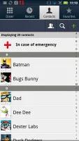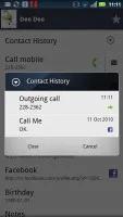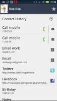 قسمت مخاطبها (Contacts) یکی از برنامههای گوشی است و از محیط استانداردی بهره میبرد. همه مخاطبها به صورت الفبایی لیست شده اند و میتوانید مستقیما به اسمهای شروع شونده با یک حرف خاص بروید. Quick contacts نیز موجود است و دسترسی سریع به بعضی از چیزها را امکان پذیر می کند. می توان مخاطبها را با چندین سرویس هماهنگ سازی کرد، از جمله گوگل، فیسبوک، و تویتر. نمایش اطلاعات یک مخاطب خاص نیز بسیار استاندارد انجام میشود، به استثنای گزینه Contact History، که همراه با پنجرهای شامل لیست تماسهای قبلی با آن مخاطب ظاهر میشود.