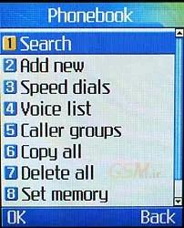 شما قادر به ذخیره حداکثر 255 ورودی (نام) به شرط پنج فیلد برای هر نام (3 شماره تلفن ، 1 آدرس (E-mail ) و یک نوشته کوتاه ) در حافظه داخلی گوشی می باشید ، همچنین می توانید هر یک از آن ها را در یکی از گروه های تماس قرار داده و یک عکس برای آن ها انتخاب نمایید تا در هنگام برقراری مکالمه نام او در کنار عکس مشخص شده قرار بگیرد .