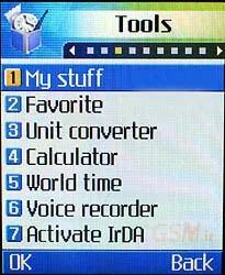 ماشین حساب ، برنامه ی تبدیل واحدها و کمیت ها ، ساعت جهانی و ضبط خبرنگاری (با قابلیت 19 ثانیه صدای اطراف و نه در هنگام مکالمه) در این قسمت قرار دارند .