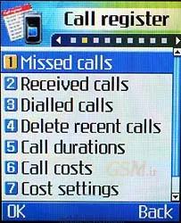 در این بخش ، لیست تماس های گرفته شده (Dialed calls) ، لیست تماس های وارد شده (Received calls) و لیست تماس های از دست رفته (Missed calls) موجود می باشد ، که هر کدام 20 شماره ی آخر را نشان می دهد که برای برخی از  آن ها ساعت و تاریخ نشان داده می شود .