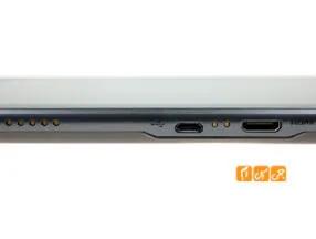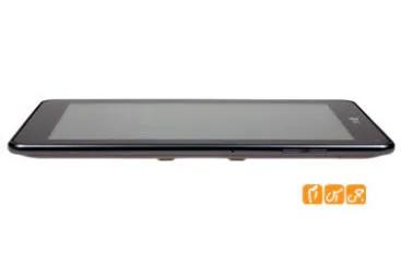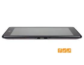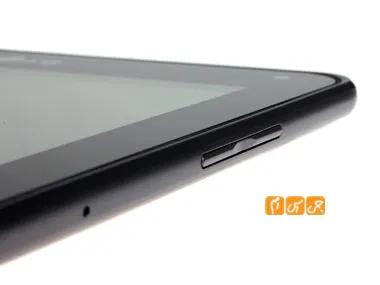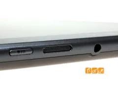 در این قسمت همچنین کلید روشن / خاموش و قفل تبلت دیده می شود و راحتی و استفاده از آن کمی سخت است و وقتی گوشی را درحالت افقی قرار می دهید این کلید به سمن چپ انتقال پیدا می کند و باز هم دسترسی به آن ساده خواهد بود .در سمت کناره ی چپ گوشی میزبان پورت microUSB که قابلیت شارژ کردن این گوشی توسط آن وجود ندارد و نیز پورت miniHDMI وجود دارد که هر دو اینها فایل پوشش می باشند .