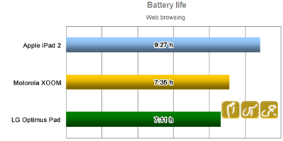 در تست کار با مرورگر این تبلت LG نتیجه ای شبیه دیگر تبلت های آندرویدی مثل Motorola XOOM در بر داشت ، اما اینها با این وجود 2 ساعت نسب به Apple Ipad 2 عقب تر هستند .حدود 7 ساعت کار مداوم با صفحات و برنامه ها و البته با سرعت بیشتری تسبت به مردم عادی این کار را انجام دادیم که برای مردم عادی نزدیک یک روز کامل به طور انجام خواهد انجامید .