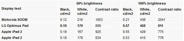 در محیط های خارج و زیر نور افتاب بسیار بد عمل می کند . در یک روز آفتابی بسیار سخت است که ببینید روی صفحه نمایش چه چیزی نوشته شده است و این بازتابش نور توسط صفحه نمایش آن باعث شده است در محیط های باز و در زاویه ی دید با این تبلت مشکل داشته باشید .در تست صفحه نمایش که در جدول زیر به تصویر کشیده ایم . روشنایی صفحه آن کمی نامعمول است ، حتی در مقایسه با تبلت های ساده تر ، پیکسل های تیره باعث کمبود روشنایی می شود و کنتراست برای خوانایی چندان قابل توجه نیست ، اما هر چه که باشد هنوز به نظر ما بهتر از Ipad 2 است .