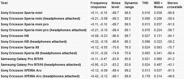 بر خلاف دیگر سونی اریکسون های آندرویدی ، Xperia Mini از صدای خروجی خوبی ، حتی در زمانی که به وسیله ی خارجی متصل می شود ف بهره می برد و زمانی که این گوشی را در ماشین و یا خانه به لوازم دیگر متصل می کنید کیفیت آن همچنان خوب باقی می ماند و در جدول زیر می توانید نتایج آزمایشات ما را مشاهده نمایید .