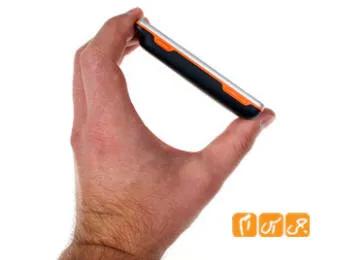 این گوشی ظاهری چشمگیر دارد. گوشه به شکل “در باز کن” آن، قسمت پایین گوشی را مشخص میکند، شکل چهار گوش بدنه را از بین میبرد، و حالت اسپرت تری به گوشی میدهد. یک قاب فلزی دور قسمت روی بدنه را گرفته، و یک نوار لاستیکی نارنجی رنگ بین آن و پوشش باتری قرار گرفته. این خط نارنجی، بر روی قاب سیاه واقعا زیبا به نظر میرسد، ولی جذابیت آن در کنار قاب سفید کمتر است.