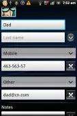 میتوانید برای هر مخاطب زمینههای مختلفی تعریف کنید(داشتن چند زمینه از یک نوع هم ممکن است). دکمههای مثبت و X به شما اجازه اضافه یا حذف زمینهها را میدهند. این زمینهها، میتوانند شامل هر نوع اطلاعاتی از جمله نام(شامل یک زمینه برای وارد کردن تلفظ نام) تا آدرس و لقب و یادداشت باشند.میتوان کاری کرد که تماسها مستقیما به پیام گیر صوتی وصل شوند. انتخاب زنگ مشخص برای هر مخاطب نیز امکان پذیر است.میتوانید با “ستاره دار” کردن یک مخاطب، او را در قسمت علاقه مندی ها قرار دهید. همچنین، در هر حساب جی-میل، یک گروه ویژه به اسم “ستاره دارها در اندروید” وجود دارد که این مخاطبها به طور خودکار توی آن میروند.برای پیدا کردن یک مخاطب دو راه وجود دارد- یک روش املایی که قسمت مربوط به آن در بالای لیست مخاطبها قرار دارد، و روش دیگری که بر اساس ترتیب الفبایی اسمها کار میکند.