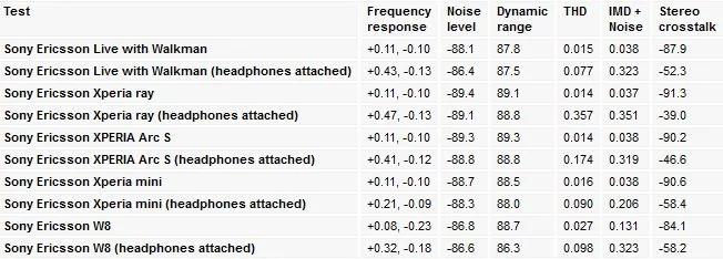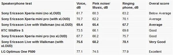 بر خلاف دیگر سونی اریکسون های آندرویدی ، Live with walkman از صدای خروجی خوبی ف حتی در زمانی که به وسیله ی خارجی متصل می شود ف بهره می برد و زمانی که این گوشی را در ماشین و یا خانه به لوازم دیگر متصل می کنید کیفیت آن همچنان خوب باقی می ماند.همراه آمپلی فایر بیرونی شما واقعاً نمره ی خیره کننده ای دریافت می کنید. گوشی live with Walkman توانست نمرات قابل قبولی را کسب کند .در پایین نتایج آزمایش را مشاهده می کنید :