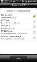 با اتصال کابل MicroUSB به گوشی ، لیست طویلی از گزینه ها در اختیار شما قرار داده می شود. گزینه های ساده ای چون Charge only (تنها شارژ گوشی) ، Disk Drive (اتصال کارت حافظه microSD به عنوان یک درایو ذخیره سازی) و HTC Sync (برای همگام سازی گوشی با HTC PC Suite ) در این لیست دیده می شوند.