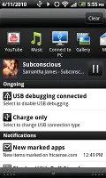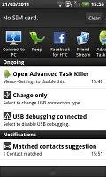 با اتصال کابل MicroUSB به گوشی ، لیست طویلی از گزینه ها در اختیار شما قرار داده می شود. گزینه های ساده ای چون Charge only (تنها شارژ گوشی) ، Disk Drive (اتصال کارت حافظه microSD به عنوان یک درایو ذخیره سازی) و HTC Sync (برای همگام سازی گوشی با HTC PC Suite ) در این لیست دیده می شوند.