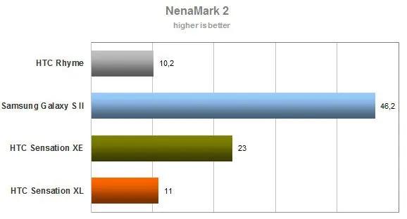 NenaMark 2 به ارزیابی عملکرد گوشی در بخش سه بعدی می پردازد؛ Rhyme دارای گرافیک 205 Adreno است و به نظر نمی رسد که قابلیت پخش بازی های جدید را داشته باشد .