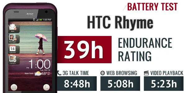 کارت حافظه ی micro SD را به راحتی می توانید بدون خاموش کردن گوشی تعویض کنید و Rhyme به همراه یک کارت حافظه ی 8 گیگابایتی عرضه می شود .باتری 1600 میلی آمپری HTC Rhyme توانست حدود 39 ساعت در حالت معمولی استفاده ی روزانه شارژ نگه دارد . در نتیجه شما می توانید 39 ساعت مقدار شارژ باتری را صرف یک ساعت تماس 3G و یک ساعت پخش ویدئو و یک ساعت وبگردی در هر روز استفاده کنید . این نتیجه از چیزی که از دیگر گوشی های هوشمند این دوره میبینیم ، بسیار بهتر است.