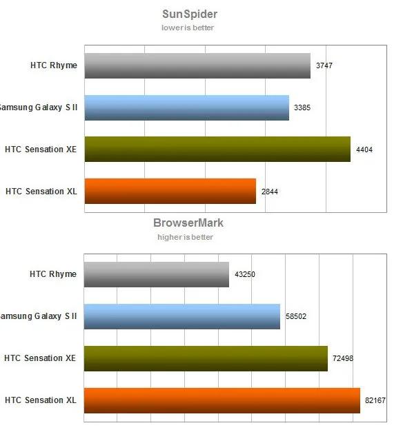 دو آزمون بعدی ما مربوط به سرعت مرور صفحات وب و همین طور تست عملکرد Java Script است . در اینجا نیز طبق معمول Rhyme نمره ی متوسطی را کسب کرد ولی البته شما هیچ مشکلی در مرور صفحات وب نخواهید داشت . HTC سعی کرده است تا با تعبیه فلش پلیری در مرورگر تا حدی در پی جبران این عقب ماندگی بر اید اما SunSpider یک کد جاوا اسکریپت محض است. با این حال نمی توان از سفارشی سازی های بی شمار HTC در مرورگر وب چشم پوشید.