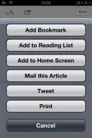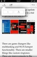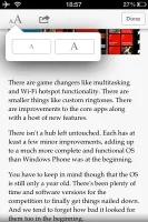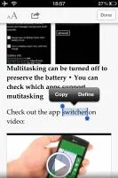 می توانید اندازه متن را با استفاده از دو کنترل که در بالای صفحه تعبیه شده اند ، تغییر دهید.همینطور می توانید کلمه ای را انتخاب و بر روی گزینه Define کلیک نمایید ،دیکشنری تعبیه شده در ios 5 باز شده و معنی آن را برای شما به نمایش خواهد گذاشت.