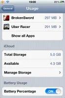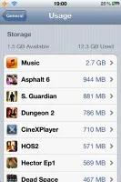 این بخش با اطلاعات مربوط به فضای استفاده شده و آزاد شروع شده و سپس لیست از حجیم ترین نرم افزارهایی که بیشترین فضا را اشغال کرده اند،که معمولا شامل Music و بازی هایی چون Infinity Blade هستند، پس از آن ها به نمایش در می آید.می توانید با استفاده از کلیدی که در انتهای این لیست ده تایی در نظر گرفته شده است به تمامی نرم افزارهای نصب شده تان دست یابید.