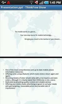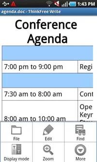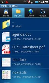 Samsung I9000 Galaxy S به همراه ThinkFree Office عرضه می شود که هم به عنوان مرورگر و هم بعنوان ویرایشگر اسناد آفیس به کار می رود. این نرم افزار به خوبی کار می کند و از قابلیت Pinch Zooming هم بهره مند است. هم پیمایش به طرفین و هم بزرگنمایی با سرعت زیادی انجام می شوند و کارآیی بسته آفیس در کل بسیار عالیست.