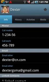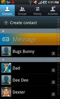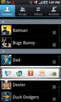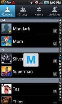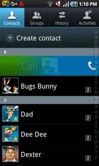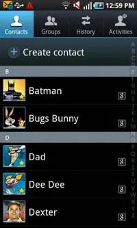 این دفترچه تلفن می تواند مخاطبین ذخیره شده در حافظه گوشی ، سیم کارت و تمامی مخاطبین Google را به نمایش در آورد. تنظیمی اختصاصی برای این منظور در نظر گرفته شده است و به همین سبب می توانید تمامی مخاطبین تان را در کنار یکدیگر و در یک جا مشاهده نمایید. می توانید با استفاده از پیمایش حرکتی یا الفبایی به جستجوی لیست مخاطبین بپردازید.