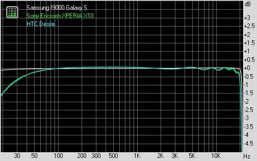تغییر شکل های فرکانسی به بهترین نحو ممکن صورت می پذیرد و در کل هیچ نقطه ضعفی در خروجی صدای I9000 Galaxy S دیده نمی شود که نیازی به تصحیح داشته باشد. نتایج این آزمون برای قضاوت شما در اختیارتان قرار گرفته است.