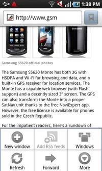 مرورگر وب I9000 Galaxy S از چینش مجدد متون هم پشتیبانی می کند و تنها لحظه ای بعد از تنظیم سطح بزرگنمایی ، ستون های متن با عرض صفحه تطابق می یابند.بدون این قابلیت مجبور بودید از بزرگنمایی بکاهید تا کل متن در درون صفحه جای گیرد و یا اینکه برای مشاهده کل متن به طرفین پیمایش می کردید.