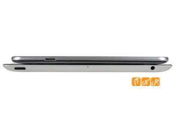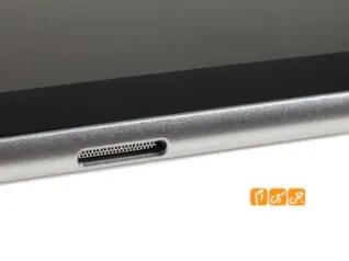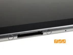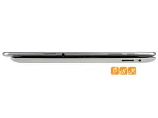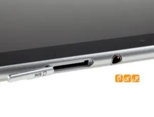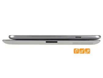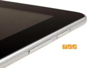 در بالای این تبلت می توان خروجی استاندارد صدای 3.5 میلیمتری و جایگان سیم کارت را یافت . جایگاه سیمکارت  به گونه ای طراحی شده است که کمی فرو رفته تر است و بیرون آوردن آن کمی با زحمت صورت می پذیرد . کلید های تنظیم صدا و کلید Power آن نیز در بالا و در گوشی سمت چپ قابل مشاهده است .