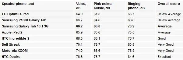 تست همیشگی و قدیمی اسپیکر را نیز بر روی Samsung Galaxy Tab 10.1 نیز انجام دادیم ، اما متاسفانه موفق به دریافت نمره ی میانگین نشد که شاید نکته ای منفی برای کاربران آینده ی آن باشد . برای اطلاعات بیشتر می توانید به جدول زیر توجه نمایید .