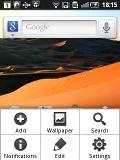با فشردن کلید منو در صفحه اصلی و سپس انتخاب گزینه add ، می توانید به افزودن محتویات به صفحه اصلی تان اقدام کنید(فشردن و نگاه داشتن انگشت تان بر روی صفحه اصلی هم چنین عملی را انجام می دهد) یا صفحات اصلی تان را حذف یا اضافه کنید و یا عکس پس زمینه تان را تغییر دهید. از عکس های پس زمینه پویا یا Live Wallpapers هم پشتیبانی می شود گرچه تنها یک ایتم از این نوع در گوشی تعبیه شده است و اگر مایل باشید می توانید از Android market به دانلود موارد دیگر بپردازید. منوی مفهومی این قسمت هم گزینه هایی برای دست یابی به قابلیت جستجو ، یادآورها و تنظیمات در اختیار شما قرار می دهد.