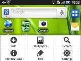 با فشردن کلید منو در صفحه اصلی و سپس انتخاب گزینه add ، می توانید به افزودن محتویات به صفحه اصلی تان اقدام کنید(فشردن و نگاه داشتن انگشت تان بر روی صفحه اصلی هم چنین عملی را انجام می دهد) یا صفحات اصلی تان را حذف یا اضافه کنید و یا عکس پس زمینه تان را تغییر دهید. از عکس های پس زمینه پویا یا Live Wallpapers هم پشتیبانی می شود گرچه تنها یک ایتم از این نوع در گوشی تعبیه شده است و اگر مایل باشید می توانید از Android market به دانلود موارد دیگر بپردازید. منوی مفهومی این قسمت هم گزینه هایی برای دست یابی به قابلیت جستجو ، یادآورها و تنظیمات در اختیار شما قرار می دهد.