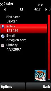 با انتخاب یکی از مخاطبان در نوار مخاطبان ، صفحه ای همراه با مشخصات مخاطب نمایش داده می شود که با صفحه ای که می توانید از طریق انتخاب آن مخاطب از طریق دفترچه تلفن مشاهده کنید متفاوت است. این صفحه شامل عکس مخاطب ،نام و شماره تلفن وی است و در زیر آن ها چهار کلید تماس ، ارسال پیام ، به روز رسانی فید و تنظیمات نمایش داده می شود.