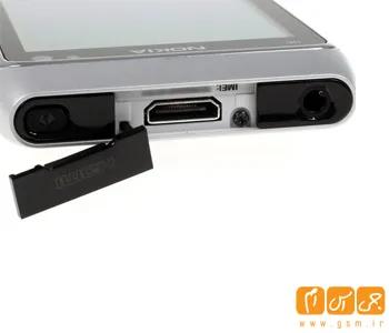 و بعد به اسلات کارت حافظه microSD می رسیم که می تواند برای انتقال داده از/به Nokia N8 مورد استفاده قرار گیرد. گرچه در هنگام اتصال گوشی در حالت Mass Storage به کامپیوتر ، هم کارت حافظه و هم حافظه گوشی در دسترس هستند و در هنگام اتصال گوشی به این روش ، توانستیم به سرعتی حدود ده مگابیت بر ثانیه هم دست پیدا کنیم. این به معنای آن است که به ندرت به استفاده از کارتخوان ها نیاز پیدا خواهید کرد.