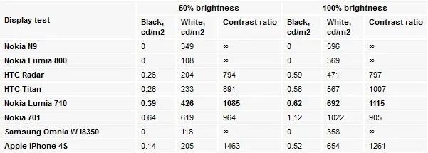 صفحه ی نمایش Nokia Lumia 710 عملکرد خیره کننده ای در نسبت کنتراست تصویر که 1 به 1000 است از خود به نمایش گذاشت ، اما بیشتر آن به خاطر روشنایی بسیار بالای صفحه ی نمایش بود . همچنین سطح نقاط سیاه صفحه هم در رده ی خوبی قرار داشت