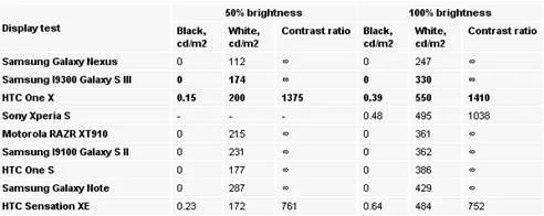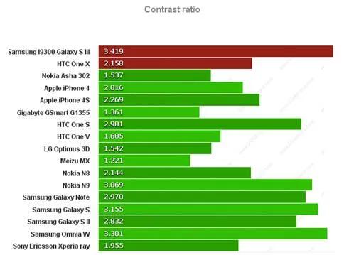 اما همچنان هر دو تراکم به اندازهی کافی زیاد هستند بنابرین شما در استفاده معمولی تفاوتی را حس نمیکنید. شما یک حرکت کمی را در جزئیات ریز در صفحه نمایش S III مشاهده میکنید اما برای دیدن آن باید بسیار از نزدیک به صفحه نمایش نگاه کنید و خیلی به آن دقیق شوید. تفاوت در ساختار صفحه نمایشها فراتر از ترتیب قرار گرفتن پیگسلهای درونی است صفحات سوپر آمولد عمق رنگی مشگی زیاد با رنگهای پرطراوت و زاویهی دید عالی دارند یک حرکت رنگی کمی دیده میشود وقتی شما خیلی دقیق شوید اما متنها و آیکونها هنوز بسیار شفاف میباشند. نرمافزار سامسونگ به شما اجازه میدهد تا اشباعیت رنگها را افزایش دهید شما میتوانید از 4 مرحلهبسیار شفاف تا رنگ کم انتخاب کنید. صفحهی IPS LCD2 One X 66 در صد روشنتر از رقیب خود است این صفحه زاویهی دید نور رنگی بهتری دارد رنگ مشگی در این صفحه عمق صفحات آمولد را ندارد اما نسبت کنتراست به اندازه کافی بالا است تا مشکلی بهوجود نیاید.
