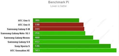 معیار Pi یک معیار تک کاربردی ساده است بنابرین ما میدانیم که چه انتظاری از آن داریم در این جا Galaxy S III نتیجه ی بسیار مشابه HTC One X بهدست آورده اگر چه حتی 4 هستهی کورتکس آن 100 مگاهرتز کمتر از آن چه HTC ارایه میدهد دارد.