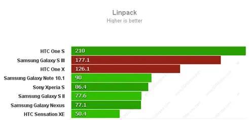 Linpack یک معیار سنج چند کاربردی است که آن را برای آزمایش 4 هستهایها ضروری میکند Galaxy S III در این جا One X را پشت سر میگذارد اما بار دیگر One S رتبهی اول را بهدست آورد این معیار سنج با بستنی حصیری کمی مشکل دارد بنابرین آن چه ما در این جا میبینیم ممکن است ناشی از این مشکل نرمافزاری باشد.