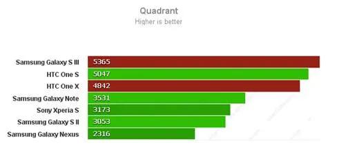 معیارسنج Quadrant یک معیار سنج مرکب است که سی پی یو، جی پی یو و I/o را آزمایش می کند Galaxy S III به راحتی در این جا بهترین رتبه را بهدست آورد و با اقتدار بالاتر از HTC One X از لحاظ کارآیی کلی ایستاد.