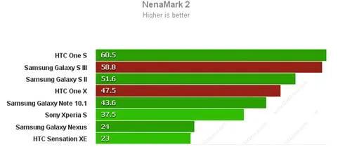 Galaxy S III در اینجا بالاتر از One X قرار میگیرد با پخش عظیم 40 فریم در ثانیه بیشتر. One X تا 63 فریم در ثانیه را پخش میکند اما بازیهای سنگینتر آن را زودتر از Galaxy S III تا 30 فریم در ثانیه کاهش میدهد.
