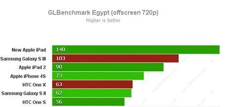 Galaxy S III بر GPU 400MP – Mali تکیه دارد اگرچه دیگر جزئیات هنوز یکسان هستند وان ایکس GPU NVIDIA را دارد و هر دو GPU مجبور به پشتیبانی تعداد یکسانی از پیکسلها هستند Galaxy S III بهترین کارآیی 3 بعدی را در بین گوشیهای آندروید تا به امروز نشان داده است و با 11 فریم در ثانیه در بالای سر HTC One X ایستاده است One S به مقدار خیلی کمتری بالای آن قرار دارد اما تنها از یک صفحهی qHD بهره میبرد. به ای نکته باید توجه شود که مدلهای قدیمیتر سامسونگ تنها تا 60 فریم در ثانیه را از لحاظ نرمافزاری پشتیبانی میکردند و ما مطمئن نمیباشیم که Galaxy S III این محدودیت را داشته باشد.