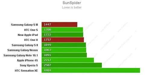 معیار سنج SunSpider به تعداد هستههای CPU اهمیتی نمیدهد اما به شدت تحت تأثیر موتور JavaScript و کارآرایی هستهها قرار دارد سامسونگ در اینجا بهخوبی عمل کرده است بهبود بسیار زیادی از Galaxy S II باسیستم عامل بستنی حصیری تا Galaxy S III در اینجا مشاهده میشود و Galaxy S III در اینجا 2 HTC سری One را نیز پشت سر گذاشته است.